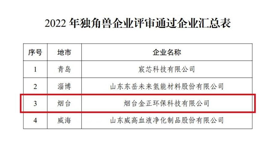 7月19日,山東省工信廳正式公布2022年獨角獸企業榜單,煙臺金正環保強勢上榜,成為本年度僅有的4家獨角獸企業之一。